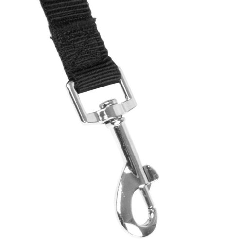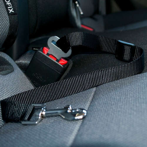 Seat belt restraint for your dog. Made from strong black webbing, this lead plugs into the seat belt to prevent your dog from jumping around or out the door or window of your vehicle. Can be adjusted to allow your dog to sit, stand or lie down comfortably. Clips to collar or harness with rotating clip to reduce tangling. Suitable for cars, vans and pickup trucks.